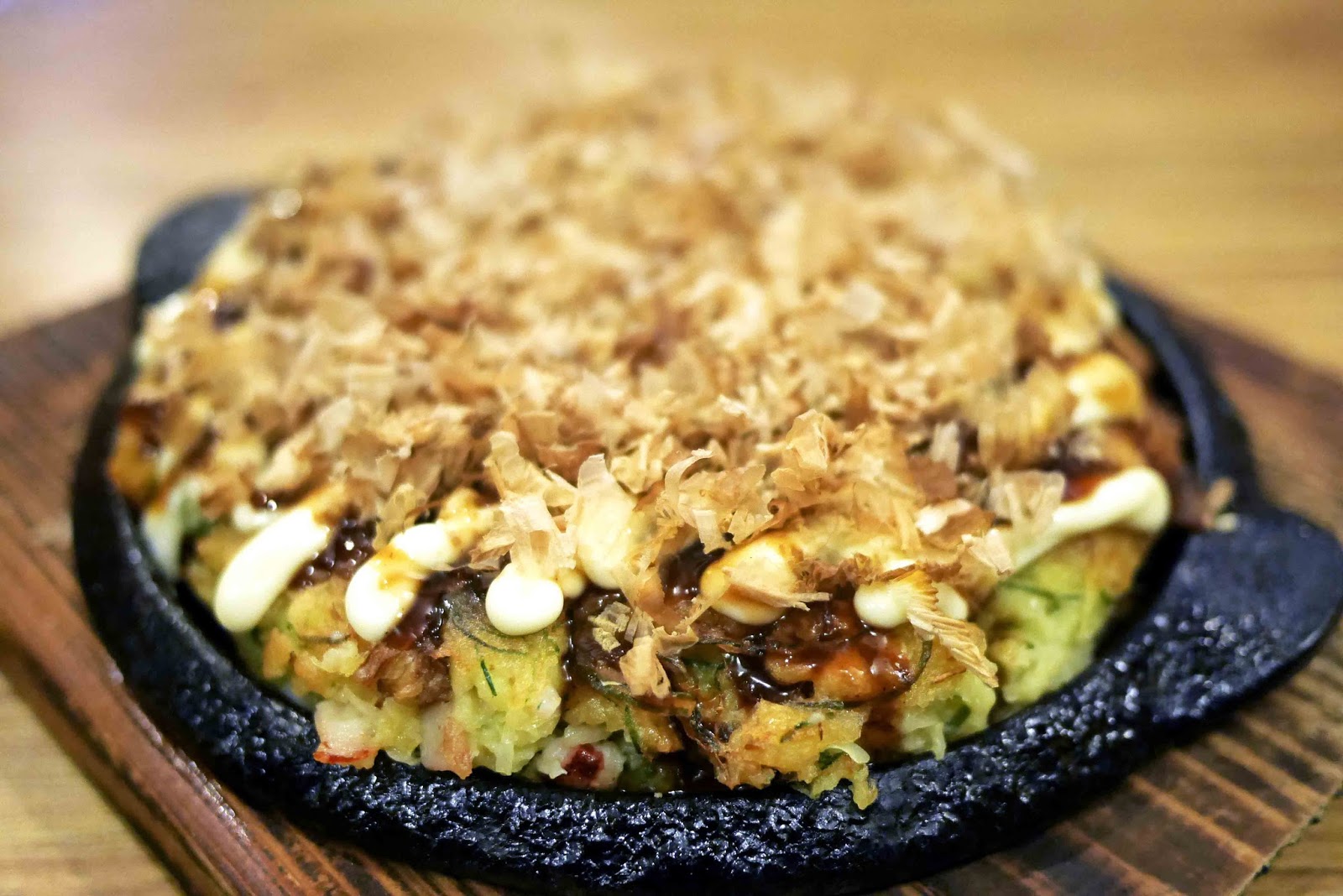 Puncak hari ini !! Okonomiyaki super tebal ini! Ini harus menjadi okonomiyaki terbaik yang pernah saya miliki! Tidak hanya tebal, tetapi juga memiliki jumlah yang topping yang berlimpah dan tambalan, sehingga tidak hanya semua telur! Saus dan mayones di atas adalah bagian terbaik! Di atas semua itu, harganya hanya Rp 28K !! : D