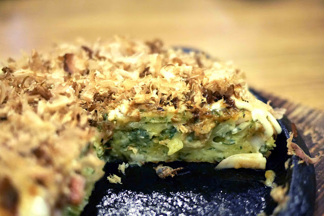 Puncak hari ini !! Okonomiyaki super tebal ini! Ini harus menjadi okonomiyaki terbaik yang pernah saya miliki! Tidak hanya tebal, tetapi juga memiliki jumlah yang topping yang berlimpah dan tambalan, sehingga tidak hanya semua telur! Saus dan mayones di atas adalah bagian terbaik! Di atas semua itu, harganya hanya Rp 28K !! : D