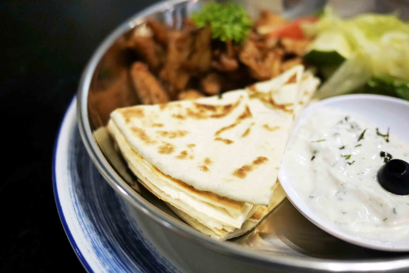 Jadi dalam piring ini, kami mendapat sedikit DIY di sini. Saya menyukai bagaimana roti pita yang sempurna tipis dan apa yang membuat saya heran adalah ayam yang super lezat !! Ini semacam seperti tandoori India dan sangat sempurna dengan roti pita, karena memiliki rasa yang benar-benar kuat. Ini hanya sempurna !!