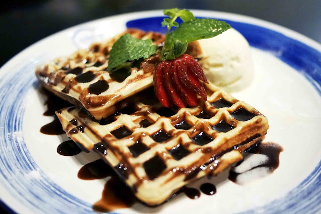 BELGIAN WAFFLE SERVED WITH CHOCOLATE SAUCE AND ICE CREAM IDR 50K