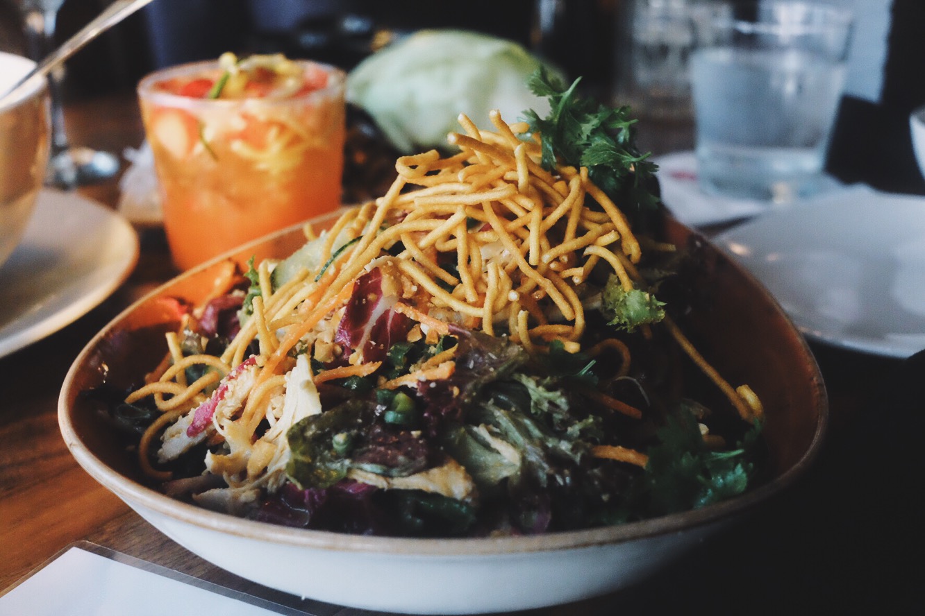 A light and refreshing salad with carrots, cucumber, ginger, and cabbage coleslaw. Tossed in a peanut lime dressing then finished with fresh cilantro and crushed peanuts.