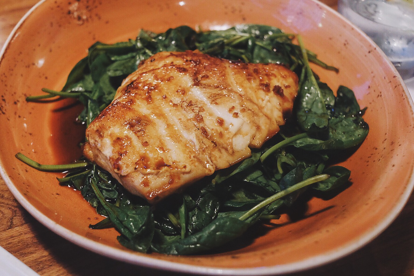 Filet of sea bass marinated in steeped oolong tea and ginger, then served on a bed of wok tossed spinach.