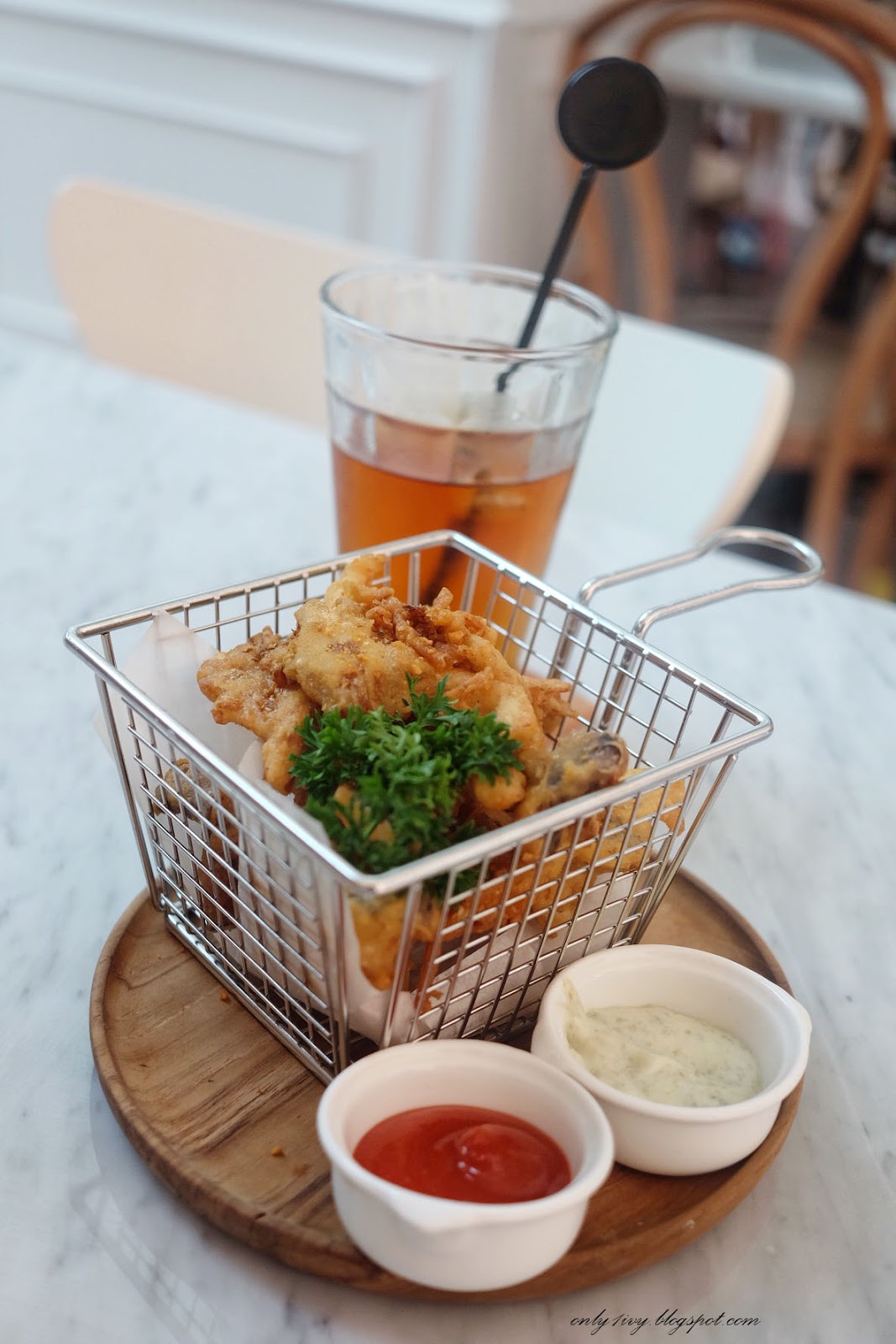 Digoreng, renyah dan tidak berminyak dengan dua saus, mayo dan cabai. Saya menyukai tampilannya.
