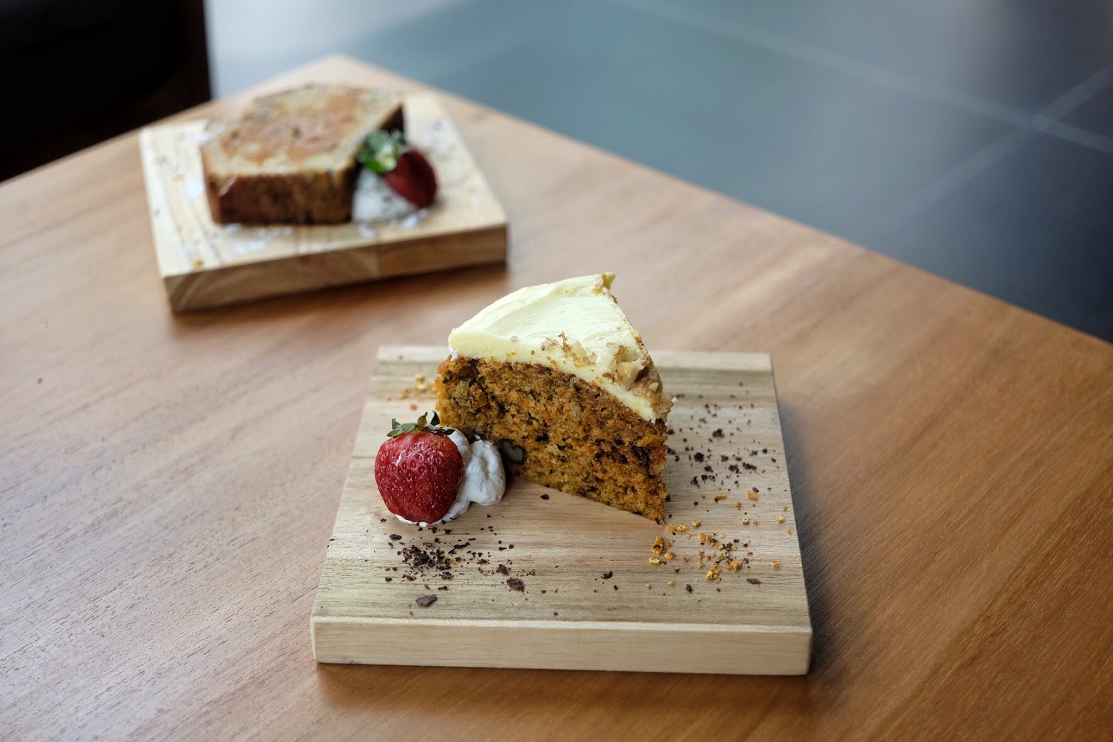 Keduanya disajikan dalam tampilan sederhana. Carrot cake enak dengan krim keju dengan kenari atas dan kenari cincang di dalamnya. Adapun roti pisang, saya selalu memiliki untuk roti pisang yang disajikan dengan kacang cincang, beberapa tukang roti akan menempatkan kismis atau bahkan chocolate chips. Versi mereka polos, dan itu baik-baik saja sebagai roti pisang asli.