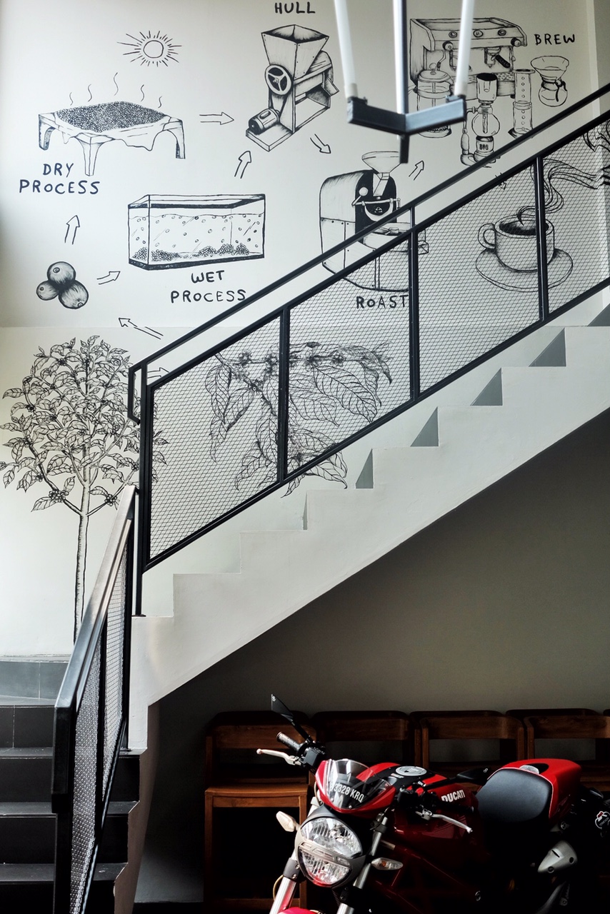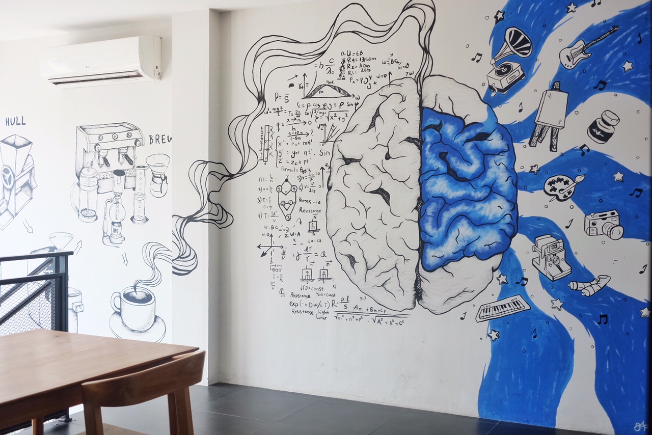 Untuk mural di dinding mereka, saya pikir mereka mencoba untuk menjelaskan tentang bagaimana proses pembuatan bir dan kopi bagaimana kopi mempengaruhi kerja otak seperti yang saya lihat di lukisan besar yang nampak seperti otak.