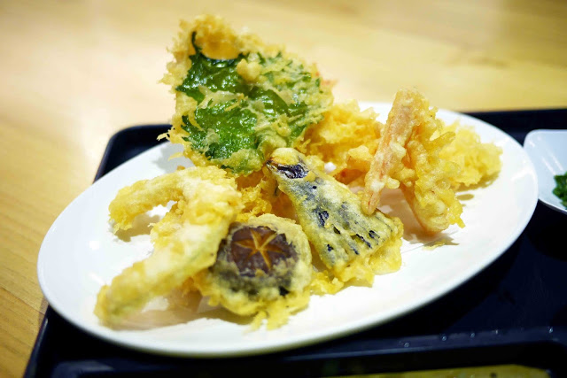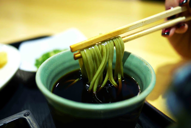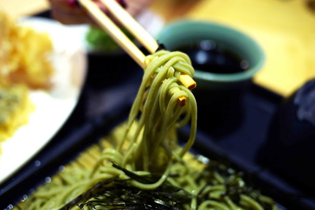 Ini adalah makanan asli dari Jepang! Tidak banyak orang Indonesia yang menyukainya tetapi saya pikir, orang Jepang pasti menyukainya! Mie berwarna hijau ini dibuat dari gandum dan teh hijau dan Anda tidak perlu mencelupkan mie ini ke mentsuyu. Saya pribadi suka menambahkan wasabi ke mentsuyu, sejak saya pernah mencobanya di pesawat (maskapai Jepang). Keseluruhan dari makanan ini pasti cukup untuk membuat Anda kenyang, dan itulah alasan kami tidak bisa menyelesaikan satu piring mie yang tersedia! Kelezatan tempuranya memang tidak diragukan lagi, baik dicelupkan maupun tidak dicelupkan ke mentsuya!