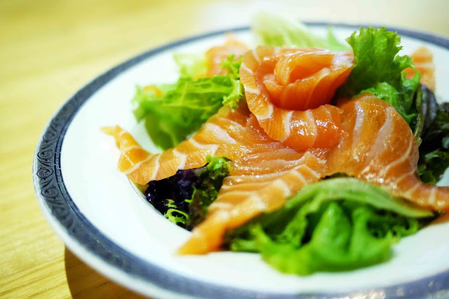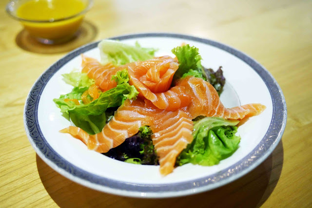 Saya pikir ini benar-benar segar, terutama dressing yang terbuat dari wasabi, wortel, dan bawang! Rasanya sedikit pedas, dan tentunya cukup membuat Anda terbangun! Dan lagi, Anda tidak perlu mencelupkan salmon ke wasabi dan soy sauce, cukup gunakan saja dressing yang ada!