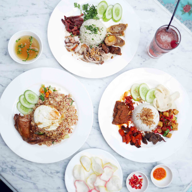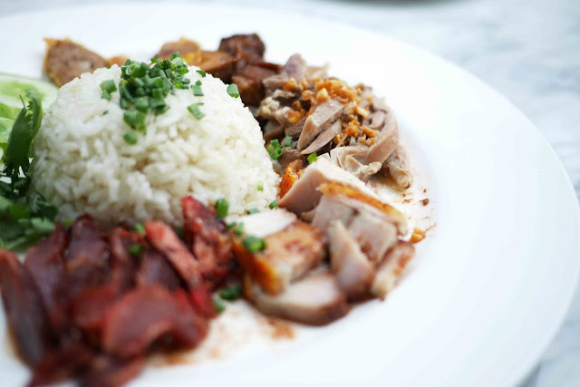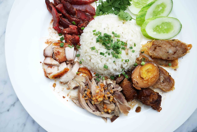 Hainan rice, chicken, fragrant spiced pork, sweet soy egg, roasted pork.