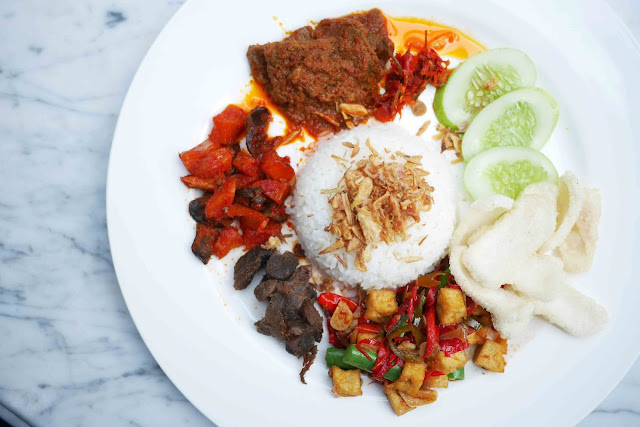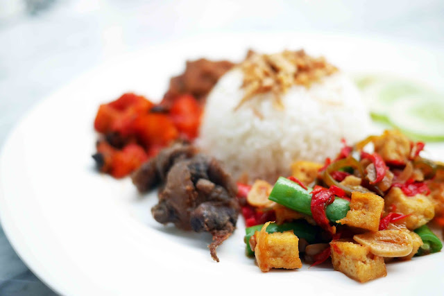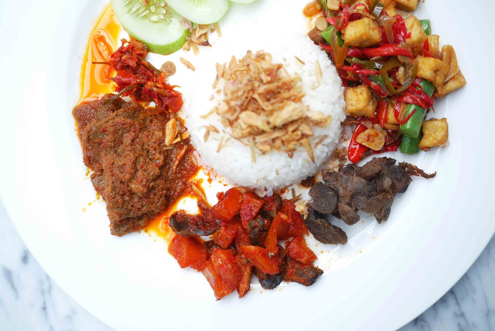 White rice served with braised chicken in spicy coconut sauce, spicy assorted giblets and shrimp sauce, tauco sauced tofu, teri medan, fried fresh chili.