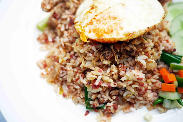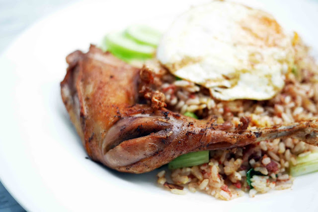 Fried rice, corned beef, leek, fried egg, fried chicken, brined cucumber and Indonesian chips.