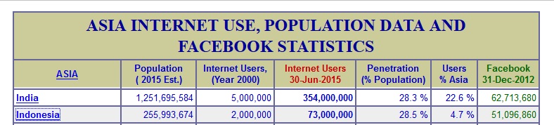 Seperti Google, Facebook pun sebenarnya telah melirik Indonesia, salah satunya dengan kedatangan Mark Zuckerberg ke Indonesia menemui Presiden Jokowi yang pada Oktober lalu masih menjadi presiden terpilih, dengan menawarkan internet.org. Bagaimana tidak, Indonesia tercatat sebagai pengguna facebook terbanyak kedua dunia setelah India, menurut data 2012.