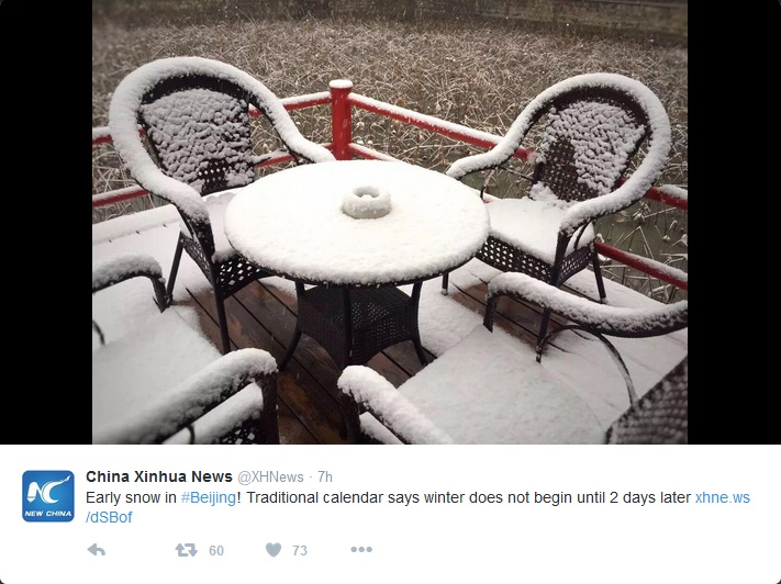 (Business Lounge Journal – News) Di luar dugaan, salju datang lebih awal di Beijing dan kota-kota lain di Tiongkok Utara, pada Jumat (6/11). Hal ini menyebabkan dilema lalu lintas bagi jutaan orang dan alasan untuk mulai menyediakan pemanas untuk kompleks perumahan juga lebih cepat dari jadwal.