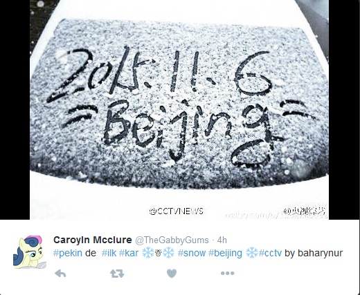 Turunnya salju kali ini adalah yang tercepat selama enam tahun terakhir di Beijing sejak badai salju menimpa ibukota pada 2 November 2009. Ahli Meteorologi mengatakan salju akan membantu untuk tumbuhan gandum di Tiongkok Utara Selain itu warga juga diperingatkan untuk berhati-hati dan menghindari keracunan karbon monoksida oleh karena pemanasan mulai terjadi.