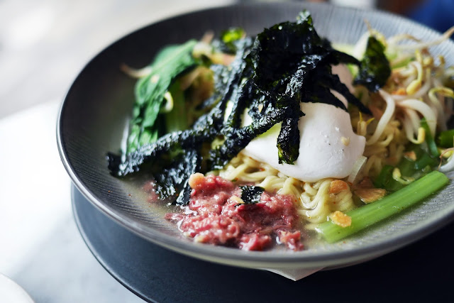 Anda bisa menebak Indomie rasa apa yang digunakan mereka untuk yang satu ini? Kami tidak bisa. Saya pikir ini menggunakan indomie ‘soto’ tapi teman saya mengatakan ini ‘ayam bawang’! Nah rasa apa pun itu, Indomie selalu lezat! Mereka meng-upgrade ke gourmet dengan menambahkan topping seperti nori, telur rebus, kornet, dan banyak lagi! Anda dapat memiliki yang original atau pedas, dengan menambahkan cabai cincang.