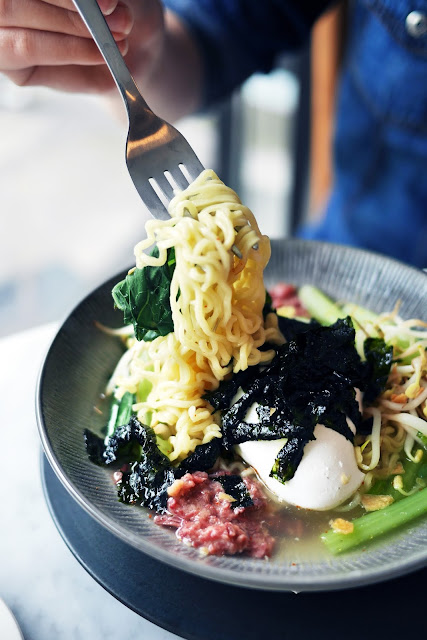 Goedkoop special boiled noodles street style with egg, seaweed (nori), garlic, bean sprout, green onion and corned beef.