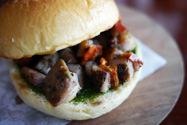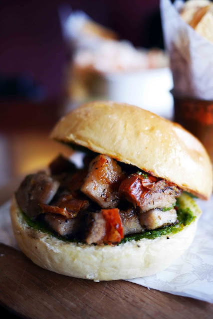 5-hour roasted belly, kale pesto, burger bun.