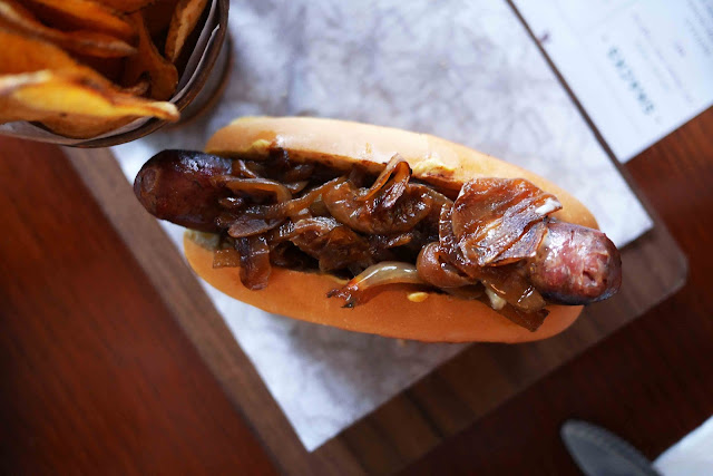 House made andouille pork sausage, onions, mustard, mayo, brioche hot dog bun.