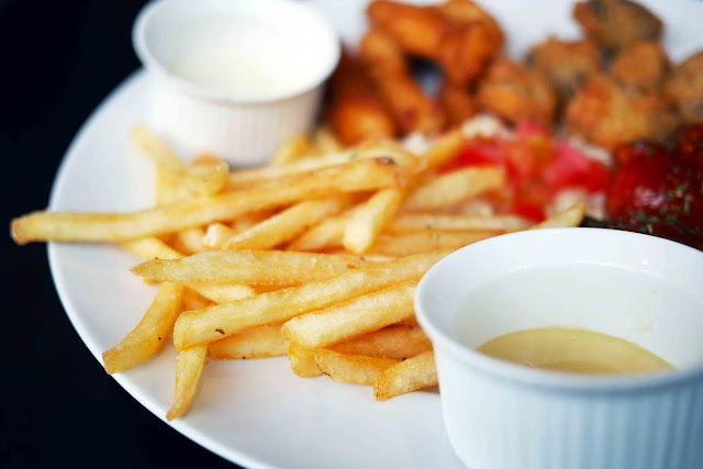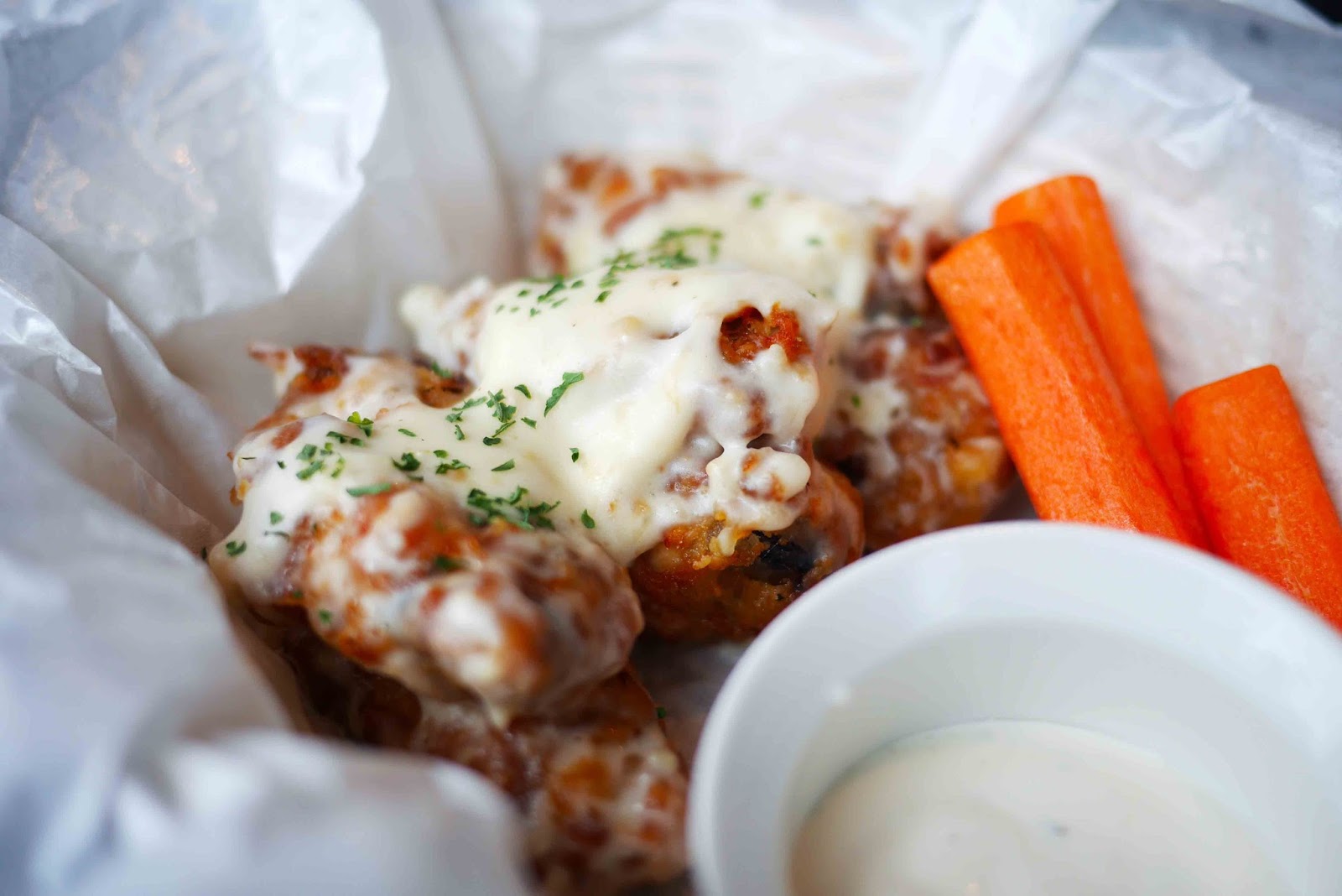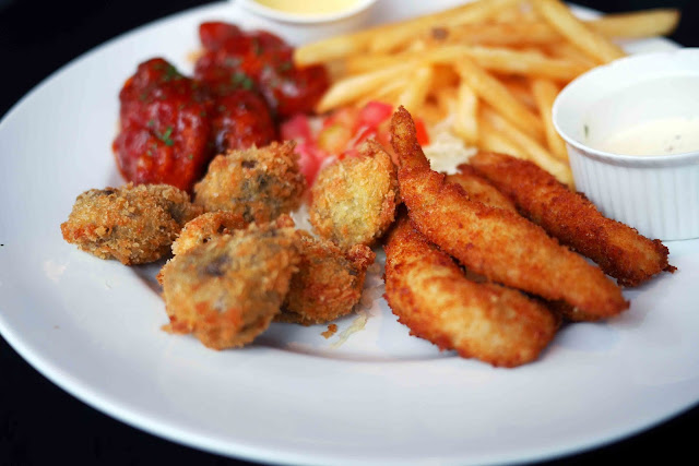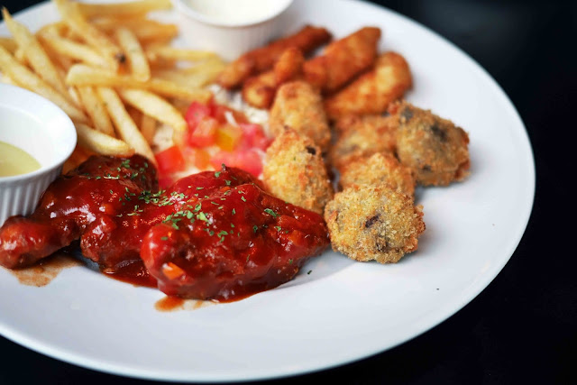 Jangan menilai buku dari sampulnya. Meskipun ini tampak kering tetapi semua ini benar-benar lezat! Sekarang, Anda mungkin bertanya-tanya mengapa saya mendapat chicken wings. Ya, karena hari itu hari Rabu dan restoran memberikan promosi untuk sayap ayam seperti di Wing Stop. Di sini, di The Amerikana, promosi khusus adalah diskon 50% untuk sayap dalam rasa apapun yang Anda inginkan, ada buffalo, mango habanero, BBQ, red hot, original, and this garlic parmesan.