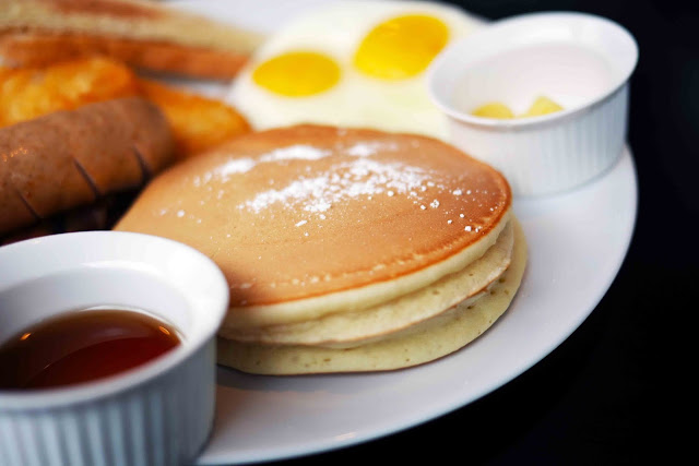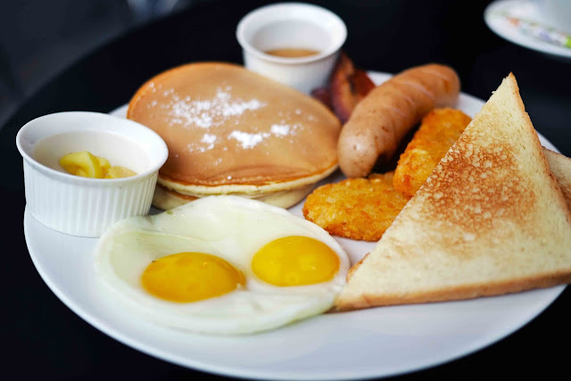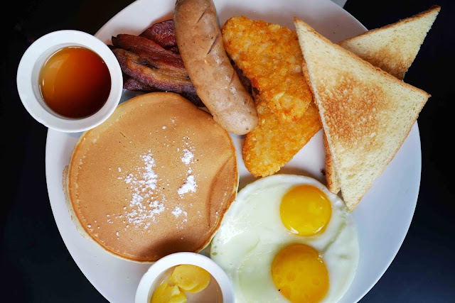 Two buttermilk pancakes, a slice of grilled pork/beef ham, two pork/beef bacon strips, two sausage links, two eggs, choice of potatoes, choice of bread.
