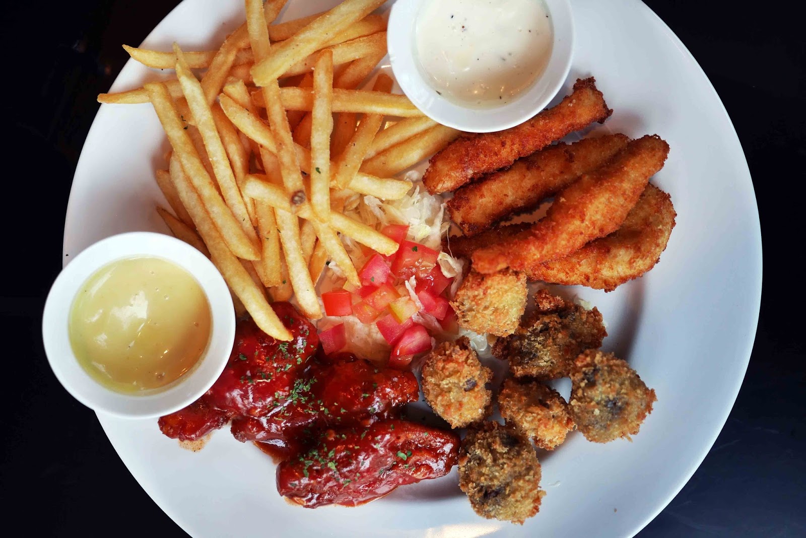 Traditional buffalo wings, chicken tenders, fries and cheddar bites.