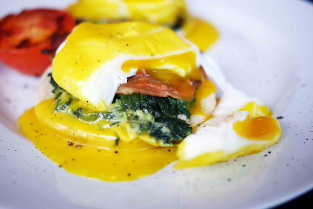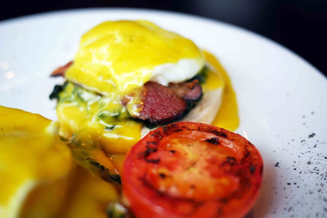 Beef bacon on a toasted English muffin, poached eggs, hollandaise sauce, garlic sauteed spinach, and a roast tomato.