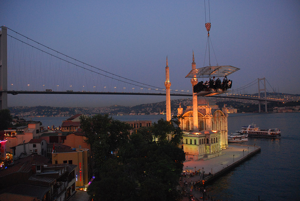 Untuk beberapa kesempatan, acara bersantap akan disertai dengan hiburan khusus, seperti permainan piano yang ada pada sebuah arena yang juga ditarik ke atas bersisian dengan tempat makan.