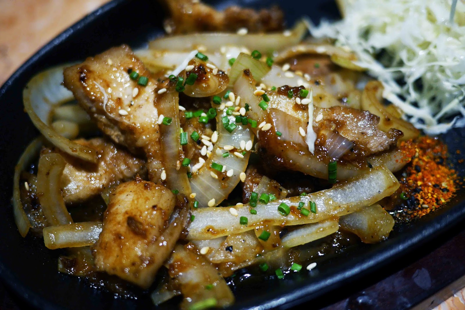 Teppan grilled pork belly with sweet onion and ginger sauce.