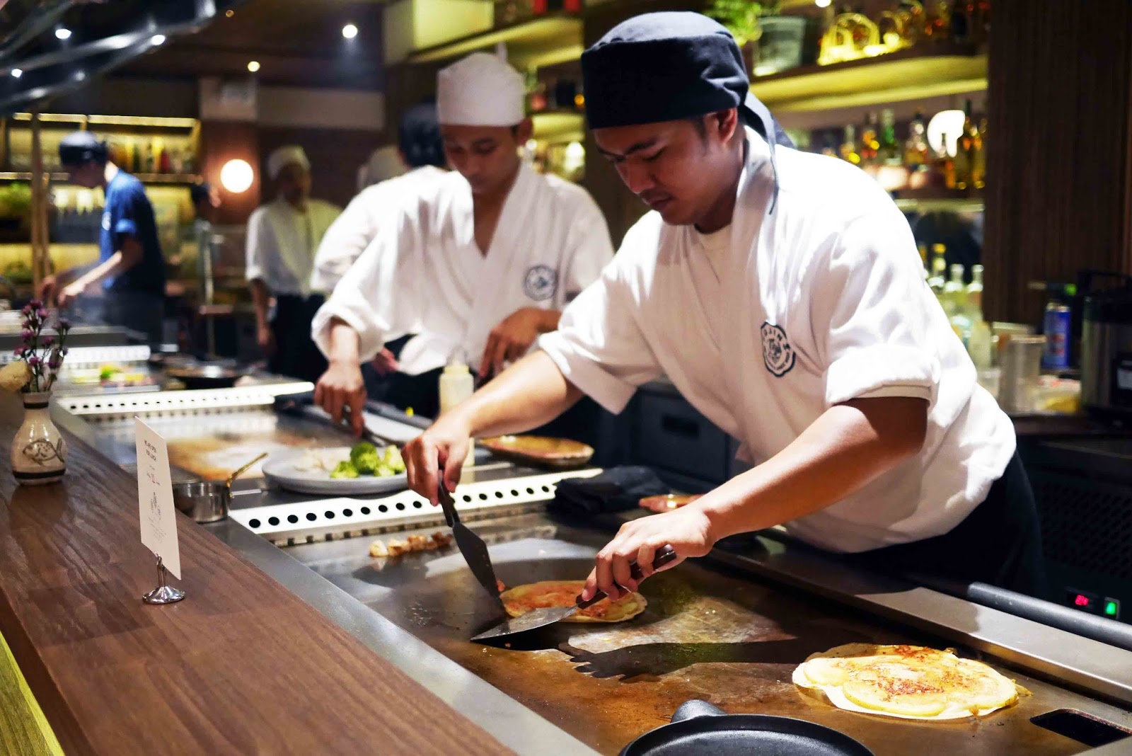 Konsep mereka adalah memasak segala sesuatu dengan gaya teppanyaki dan kita benar-benar dapat melihat mereka memasak di sini di bar teppan. Anda dapat yakin bahwa itu semua dimasak dengan gaya teppanyaki sebab semua makanan akan disajikan dari bar ini!