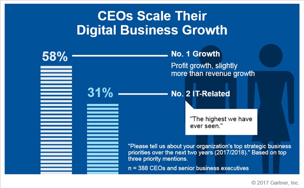 Pada April 2017, Gartner menerbitkan CEO and Senior Business Executive Survey, sebuah survei yang dilakukan pada C-level business executive mengenai apa yang menjadi prioritas, perhatian, dan sikap mereka kepada teknologi. Survei tahunan ini melibatkan 388 responden yang 50 persen berasal dari perusahaan dengan penghasilan di atas 1 milyar dolar Amerika. Survei dilakukan melalui telepon, secara online, dan juga melalui media cetak selama kuartal 4 tahun 2016, untuk pandangan mereka ke tahun 2017 dan 2018.
