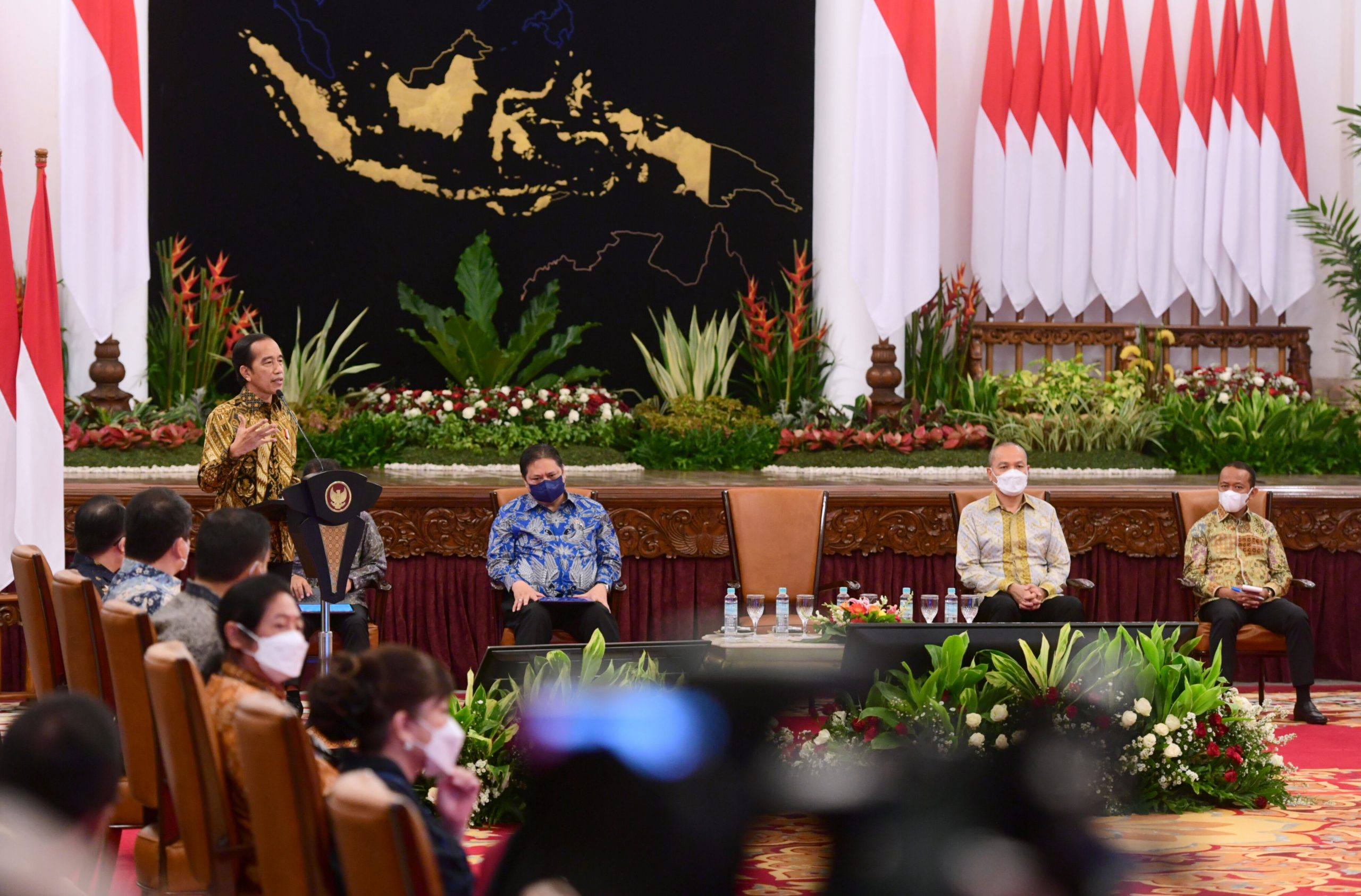 Secara jelas Presiden Jokowi menekankan bahwa kunci pemulihan ekonomi pada tahun 2022 hanya ada satu, yakni pengendalian Covid-19. Selama laju pandemi tidak berhasil dikendalikan dengan baik, perekonomian akan terancam mengalami keterpurukan kembali. Dalam pidatonya, Presiden Jokowi juga mengajak untuk bersyukur terutama atas sejumlah hal terkait penanganan Covid-19. “Jika kita kembali melihat pada pertengahan Juli 2021 lalu, saat kasus harian mencapai 56ribu, betapa sangat meloncatnya hanya dalam waktu 2-3 minggu langsung berada di puncak, 56ribu. Rumah sakit pontang-panting, urusan oksigen, obat. Kuncinya menurut saya adalah gotong royong, kerja bersama-sama, solidaritas antar seluruh elemen bangsa dan itu sudah kita tunjukkan pada Juli, Agustus, September. Kita bisa melakukan itu. Sekarang kasus harian sudah berada di kisaran 500, 400, 300. Ini patut kita syukuri. Tetapi hati-hati, lihat juga perkembangan Covid-19 di negara-negara lain,” papar Presiden Jokowi.