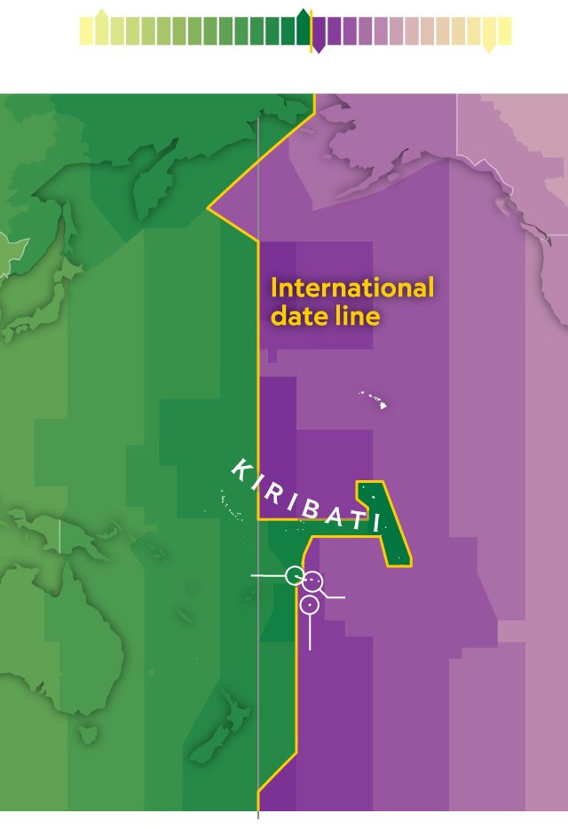 Ini merupkan perkembangan yang relatif baru. Garis penanggalan internasional pernah memotong Kiribati, artinya hari bisa berbeda tergantung pada apakah Anda berada di salah satu pulau paling barat atau paling timur negara itu. Namun pada tahun 1995, Kiribati memindahkan garis penanggalan sehingga semua pulaunya akan mengamati hari yang sama pada waktu yang sama—dan memenangkan arus turis yang ingin menjadi yang pertama berdering di milenium baru.