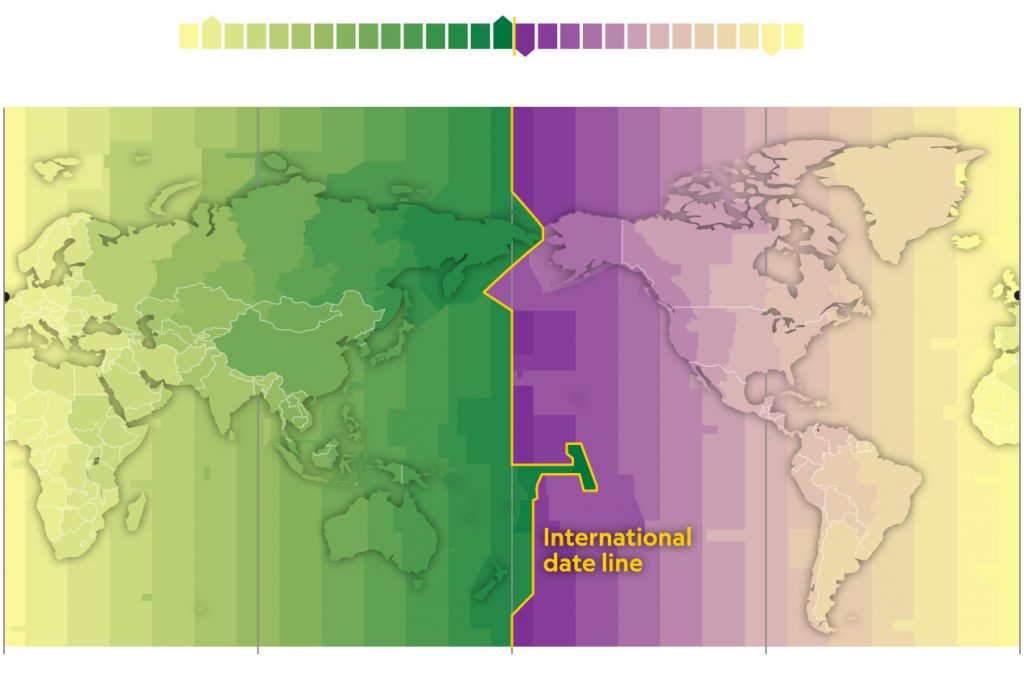 Hal ini dikarenakan kekhasan garis tanggal internasional, titik awal dan akhir secara resmi pada setiap hari. Gagasan tentang garis penanggalan diperkenalkan pada sebuah konferensi pada tahun 1884 ketika dunia berusaha menciptakan keteraturan dengan munculnya jalur kereta api dan perjalanan internasional. Garis penanggalan internasional kira-kira mengikuti meridian ke-180 dari utara ke selatan melalui tengah Samudra Pasifik. Itu terletak di belahan dunia dari meridian utama, yang melintasi Greenwich, Inggris, di Britania Raya.