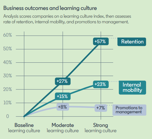 Laporan ini kemudian menilai kinerja perusahaan dalam talent metrics yang penting. Temuan ini sangat mengejutkan. Perusahaan dengan budaya pembelajaran yang kuat nampak memiliki tingkat retensi yang lebih tinggi, mobilitas internal yang lebih besar, dan jalur manajemen yang lebih sehat dibandingkan dengan perusahaan dengan komitmen yang lebih rendah.