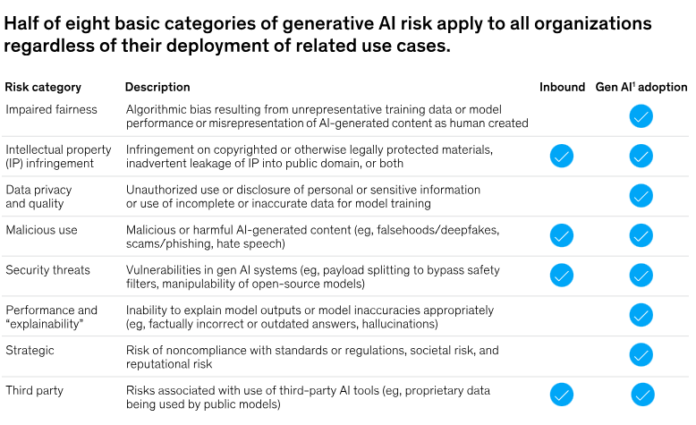 Menurut Mckinsey risiko terkait gen AI dapat ditangkap dalam delapan kategori utama. Kategori-kategori ini mempertimbangkan risiko masuk dan risiko yang diakibatkan langsung dari penerapan alat dan aplikasi gen AI. Setiap perusahaan harus mengembangkan beberapa versi taksonomi inti ini untuk mendukung pemahaman dan komunikasi mengenai risiko yang timbul dari penerapan gen AI.