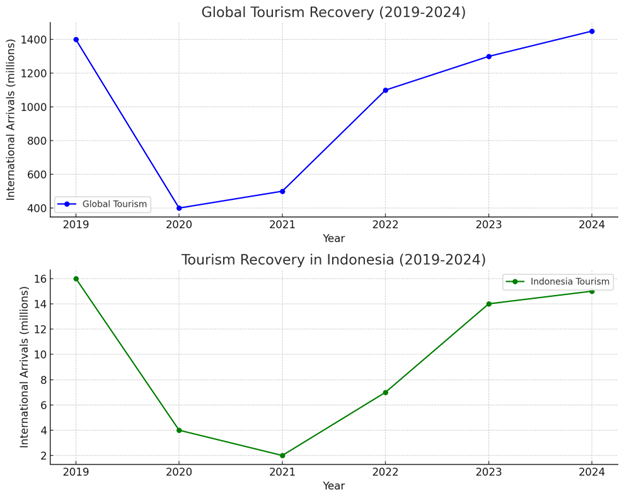 Dua chart berikut menggambarkan tren pemulihan pariwisata global dan Indonesia, menyoroti pola pertumbuhan kedatangan wisatawan internasional pasca-pandemi. Chart pertama menunjukkan gambaran umum tingkat pemulihan wisatawan internasional secara global berdasarakan United Nations World Tourism Organization (UNTWO), sedangkan chart kedua fokus pada performa pariwisata Indonesia selama periode yang sama berdasarkan Badan Pusat Statistik (BPS) dan laporan dari Kementerian Pariwisata dan Ekonomi Kreatif (Kemenparekraf RI).