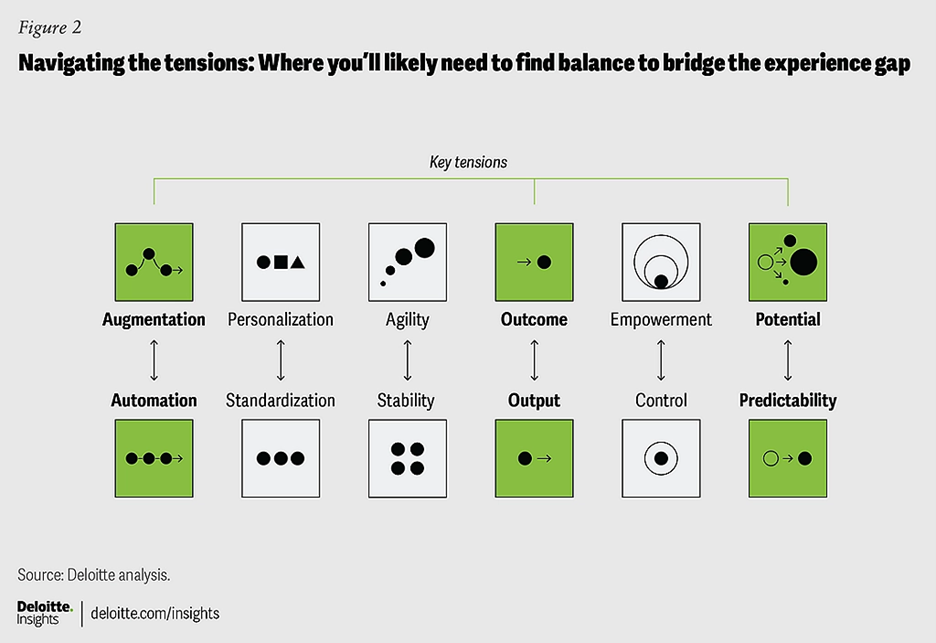 Bersumber dari analisis Deloitte yang baru-baru ini dipublikasikan, gambar ini mengidentifikasi pasangan konsep yang bertolak belakang yang memerlukan keseimbangan. Deloitte menekankan pentingnya menyeimbangkan berbagai ketegangan operasional untuk secara efektif mencapai tujuan bisnis dan meningkatkan pengalaman pemangku kepentingan. Keseimbangan antara setiap pasangan ini menjadi kunci bagi strategi manajemen yang berhasil dan adaptif di tengah perubahan lingkungan bisnis.