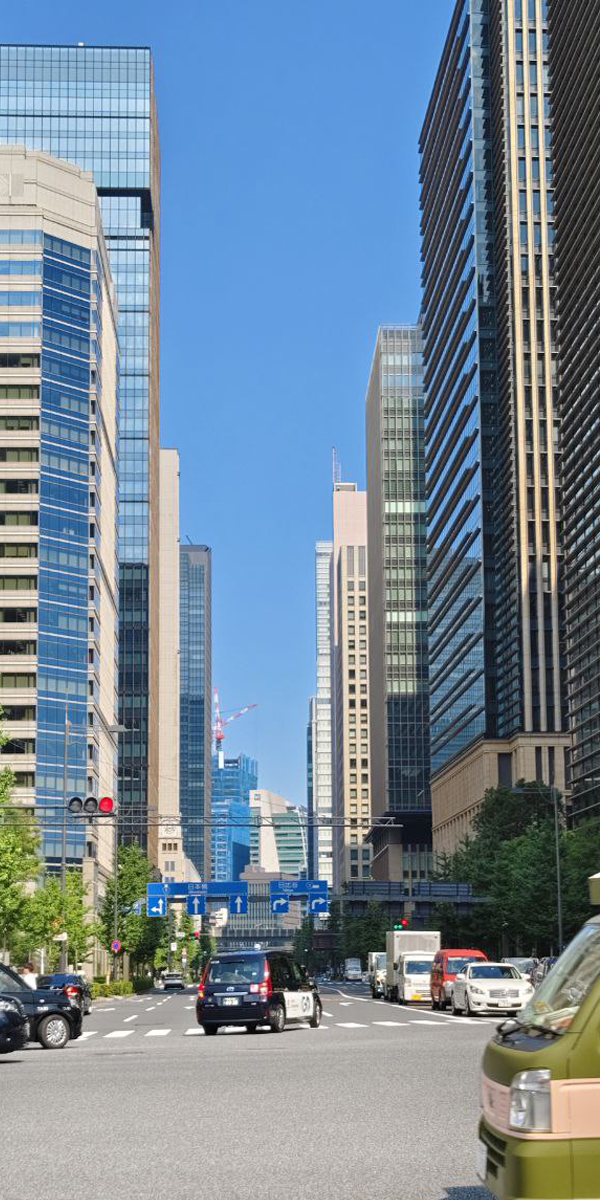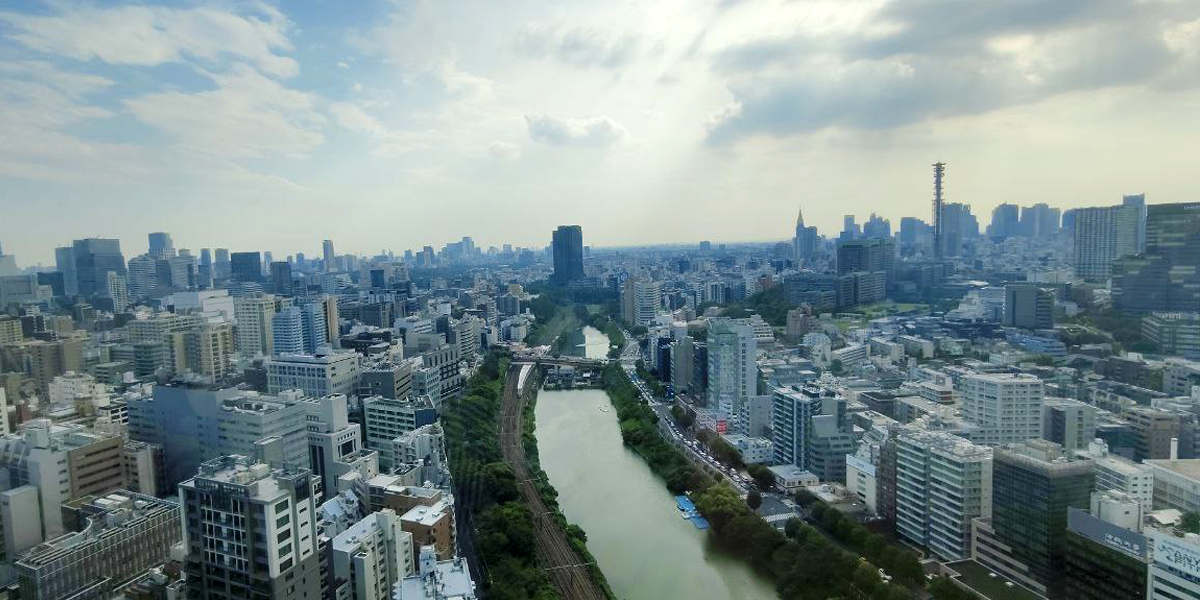 Pemandangan udara dari kawasan Iidabashi menuju arah Shinjuku, Tokyo. Sungai Kandagawa mengalir di tengah lanskap urban, diapit rel kereta dan deretan gedung bertingkat yang mencerminkan keseimbangan antara alam dan kepadatan kota metropolitan Jepang. Di kejauhan tampak area Shinjuku dengan gedung-gedung pencakar langit ikoniknya.