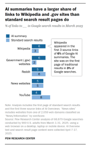 Link Wikipedia sedikit lebih sering muncul di ringkasan AI dibandingkan halaman pencarian standar, sementara link YouTube sedikit lebih umum di hasil pe ncarian standar daripada di ringkasan AI.