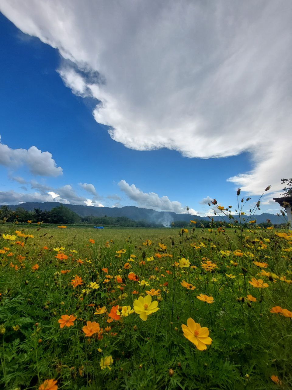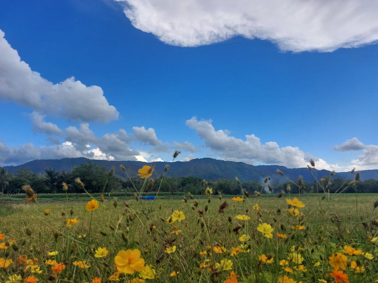 Baruara adalah salah satu desa di Kecamatan Balige, Kabupaten Toba, Provinsi Sumatera Utara, Indonesia. Suasana pedesaan atau dataran dengan hamparan bunga kosmos berwarna kuning–oranye di latar depan, sawah atau padang di tengah, dan pegunungan di kejauhan. Langitnya biru cerah dengan awan tebal bergulung.