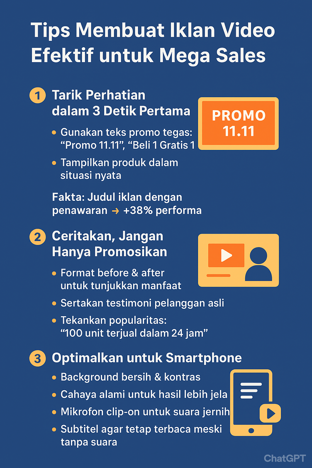 Tampilkan kata kunci promo seperti “Promo 11.11”, “Beli 1 Gratis 1”, atau “Mega Sales” dengan teks tebal. Fakta: Judul iklan dengan penawaran terbukti 38% lebih efektif dalam mencapai tujuan promosi dibandingkan judul tanpa penawaran. Selain itu tampilkan produk dalam keseharian. Sorot produk Anda dalam situasi nyata, seperti saat digunakan sehari-hari. Fakta: Iklan yang menampilkan pengguna produk terbukti 30% lebih efektif dibandingkan iklan tanpa visual penggunaan.