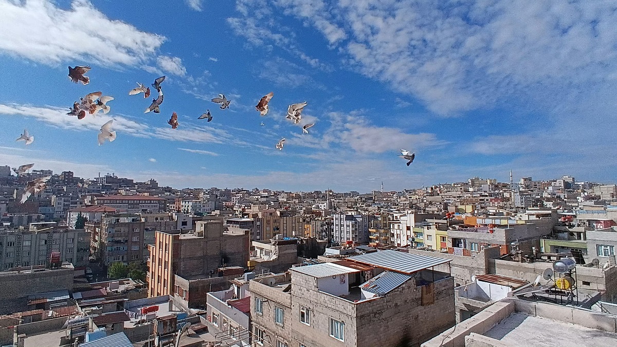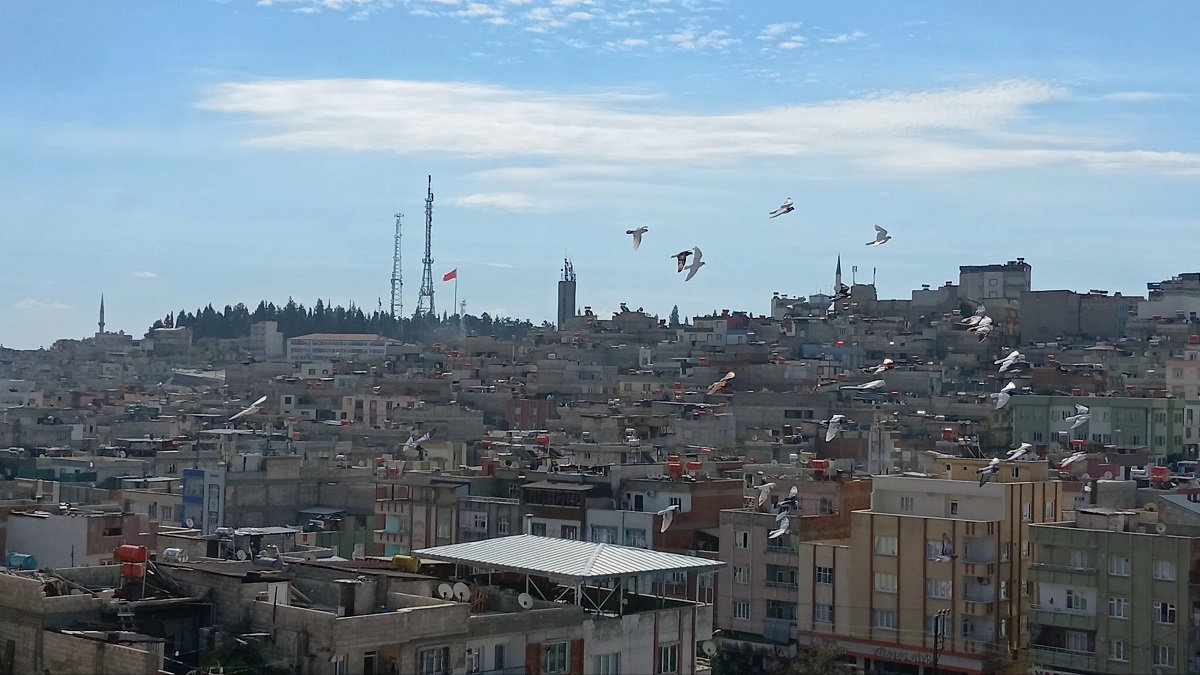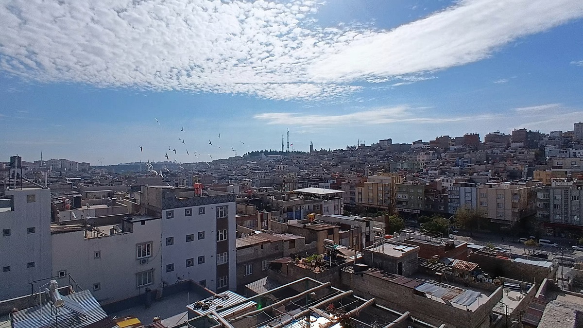 Hari yang cerah dilihat dari atas di daerah Şehitkamil, salah satu dari dua distrik utama di kota Gaziantep, Turki. Daerah ini dianggap lebih modern dan terencana, dengan banyak bangunan baru, apartemen, sekolah, serta area komersial dan perkantoran. Mevlana Sokak sendiri adalah jalan yang biasanya berada di area permukiman padat namun tertata.