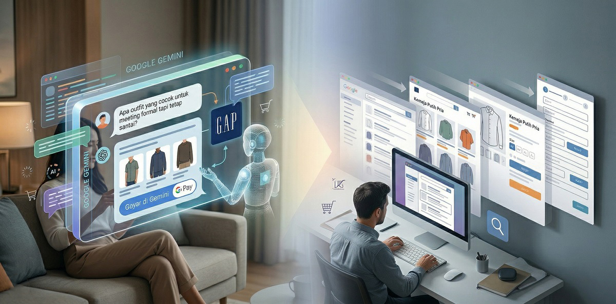 Ada satu momen kecil yang diam-diam menandai perubahan besar dalam dunia retail digital: ketika seseorang tidak lagi membuka website untuk berbelanja, melainkan mulai dengan sebuah pertanyaan. Bukan lagi “cari kemeja putih pria” di mesin pencari, melainkan, “Apa outfit yang cocok untuk meeting formal tapi tetap santai?” Dari pertanyaan itu, jawaban datang—lengkap dengan rekomendasi produk, pilihan ukuran, hingga tombol pembayaran. Semua terjadi dalam satu alur percakapan. Tanpa berpindah halaman. Tanpa membuka e-commerce.