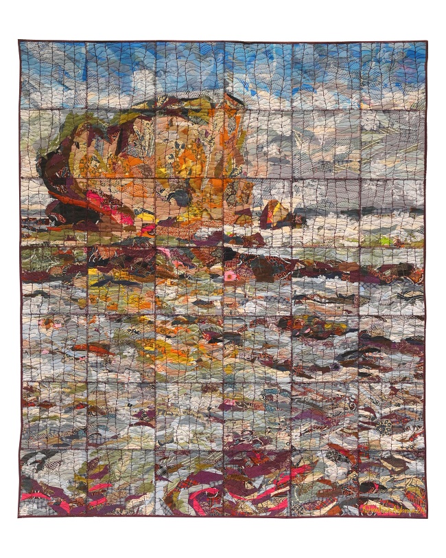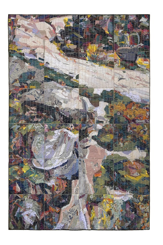 Material yang digunakan juga membawa lapisan makna tersendiri. Teknik menjahit dan patchwork—yang selama ini identik dengan kerja domestik dan perempuan—ditransformasikan menjadi bahasa artistik. Proses ini bukan sekadar teknik, tetapi juga bentuk artikulasi: tentang repetisi, ketelatenan, dan keberlanjutan. Setiap jahitan menjadi penanda waktu, setiap lapisan menjadi rekaman pengalaman.